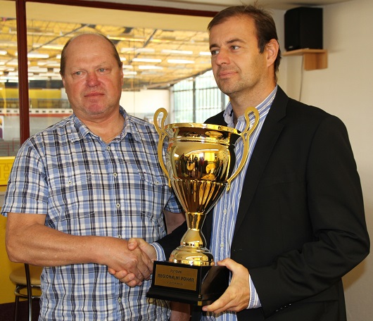 VÍTĚZNÝ MOTOR. Loňský ročník Regionálního poháru ovládli hokejisté českobudějovického Motoru. Z rukou ředitele turnaje Antonína Micky (vlevo) přebírá putovní pohár Radek Bělohlav. Foto: Zdeněk Drla