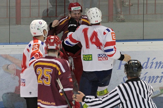 DERBY VYSOČINY. Zápasy Dukly Jihlava s Horáckou Slavií Třebíč bývají vyhrocené a jiskří to v nich. Tento obrázek se naskytl fanouškům při letošním letním utkání v rámci Regionánlního poháru, který se hrál na ledě Bílých hvězd. Foto: Jiří Mokrý (www.hstrebic.cz)