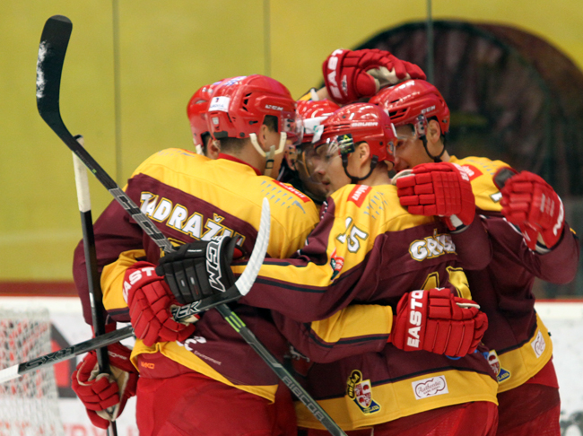 Radost červenožlutých po vstřelené brance do sítě Šumperka. Foto: Josef Plechatý