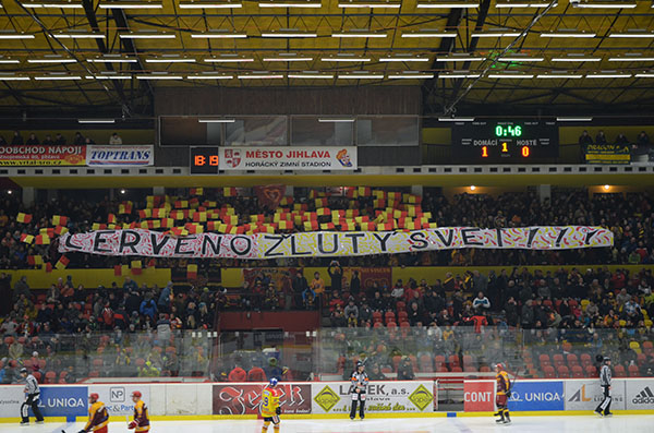 Před úvodním buly druhé třetiny přišlo na řadu druhé choreo domácích fans. Více než přes celou šíři kotle roztáhli příznivci Dukly dlouhý nápis ČERVENOŽLUTÝ SVĚT!!! Podložený kartonky stejných barev.