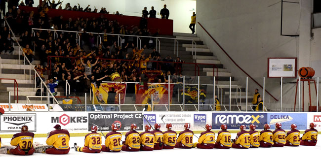 EDEN TŘÍBODOVÝM RÁJEM. Zápasy se Slavií Praha bývají pro jihlavské fanoušky velmi atraktivní. Není se čemu divit. Sešívaní jsou bývalým extraligistou a spolu s Jihlavou, Kladnem a Motorem patří mezi nejlepší čtyřku soutěže. Navíc v případě plynulé dálnice je to na slávistický stadion s troškou nadsázky „co by kamenem dohodil.“ Právě takto slavili věrní příznivci Dukly spolu s hráči tři červenožluté body z červenobílého stadionu v utkání 21. kola. Povede se Dukle podobný kousek v Edenu i podruhé? Foto: Karel Švec (ČSLH).