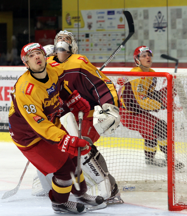 KAM TO BUDE PADAT? Alexander Grebenyuk, Jakub Škarek a Ondřej Šafář (zleva) shodně sledují kotouč v zápase 24. kola mezi Jihlavou a Mostem. Mladičký domácí gólman tehdy ochránil svojí branku před čtyřiadvaceti střelami hostí, puk do jeho sítě nespadl ani jednou a nové trenérské duo Severočechů Josef Beránek – Jan Zachrla odjíždělo domů se svým týmem s prázdnou – Jihlava se prosadila ve druhé třetině dvakrát během tří minut a zvítězila 2:0. Foto: Josef Plechatý.