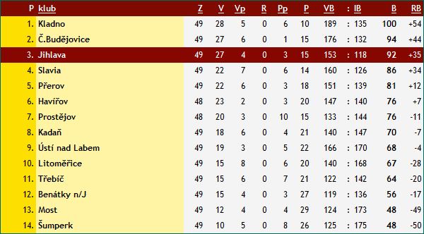 Úvodní třetina zápasu 24. kola mezi Jihlavou a Mostem téměř žádné šance nenabídla, i když měli hosté více jak minutu dlouho přesilovku pět na tři. Stav tak zůstal nezměněn, stejně tak jako při dvojnásobné přesilovce Dukly ve druhé části. Bezgólový stav prolomil až ve třiatřicáté minutě Vojtěch Zadražil a za další tři minuty zvýšil Richard Diviš. Protože ve třetí třetině se stav zápasu znovu nepohnul, připsali si červenožlutí jedenáctou výhru z posledních dvanácti zápasů.