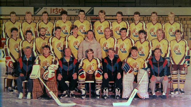 HC DUKLA JIHLAVA – MISTR 1991. Horní řada zleva: Radek Haman, Jiří Poukar, Ivo Dostál, Richard Šmehlík, Roman Mejzlík, Petr Kuchyňa, Radek Haut, Michael Vyhlídal, Milan Kastner, Roman Čech.