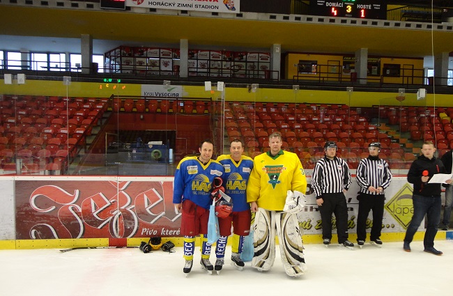 SPECIÁLNÍ CENA. Hannu Tyry (vpravo) předává speciální ocenění pro gólmana Old Boys HAS Jihlava Martina Pokorného (uprostřed). Foto: Zdeněk Trávník