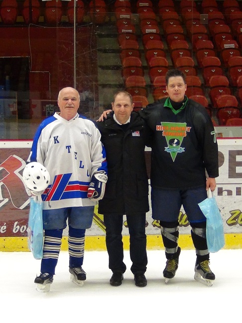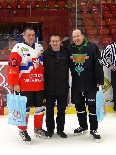 NEJLEPŠÍ HRÁČI ZÁPASU. Ludvík Švihálek (Old Boys Velké Meziříčí, vlevo) a Esa Yrjöla (HiKi-Hockey Seniors, vpravo). Ceny předával předseda jihlavské organizace České unie sportu Vítězslav Holub (uprostřed). Foto: Tomáš Lysý