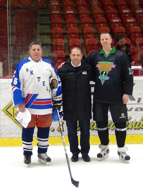 NEJLEPŠÍ HRÁČI ZÁPASU. Miroslav Slavíček (SK Telč Seniors, vlevo) a Janne Kepponen (HiKi-Hockey Seniors, vpravo). Ceny předával jednatel Dukly Jihlava Bedřich Ščerban (uprostřed). Foto: Tomáš Lysý