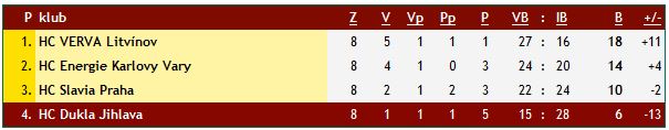 Předchozí barážové klání brala Slavia i Dukla jako šanci přiblížit se druhému místu Karlových Varů. Ba co více, Pražané mohli karlovarské hokejisty v případě vítězství v tabulce přeskočit. Jenže oba prvoligové celky na svém stadionu poprvé v probíhající baráži nebodovaly. Zřejmě v ten nejhorší možný čas. Jihlava až do samého závěru zápasu proti Litvínovu neúspěšně bojovala alespoň o vyrovnání. Slavia šla do třetí třetiny za příznivého stavu 1:0, ale Energie během osmačtyřiceti vteřin otočila zápas a tříbodovou pojistku přidala trefou do prázdné klece. Za vedoucím osmnáctibodovým Litvínovem jsou zbylé celky seřazeny s rozestupy čtyř bodů, ovšem mnohem více důležitější je, že druhé Karlovy Vary začínají jít v porovnání se Slavií a Jihlavou do trháku. Postavení v tabulce odráží i poslední čtyři zápasy zatím neúspěšných prvoligových vyzyvatelů. Slavia všechna čtyři předchozí klání prohrála a získala dva body, Jihlava se radovala během těchto kol ze zatím jediného svého tříbodového vítězství v baráži.