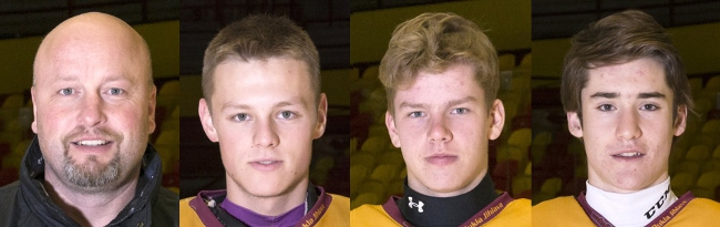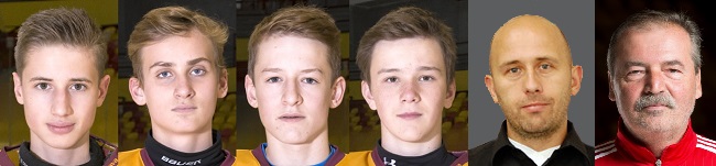 JIHLAVŠTÍ ZÁSTUPCI V U-18. Zleva Patrik Augusta, asistent trenéra Roberta Reichela, dále gólman Josef Kořenář a útočníci Pavel Kousal a Ondřej Najman. Koláž: Tomáš Lysý.