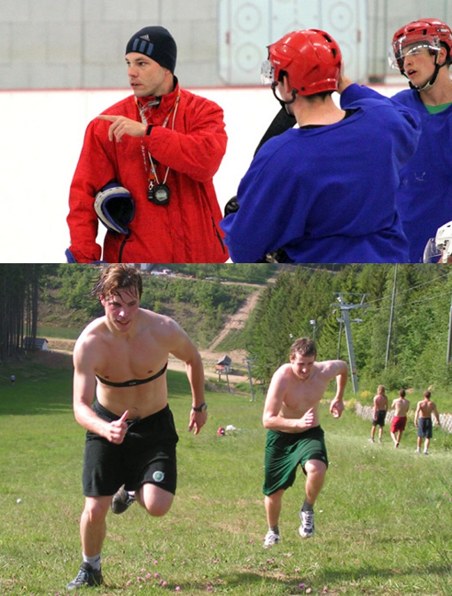 Z HRÁČE TRENÉREM. Již druhým rokem udílí Karel Nekvasil pokyny jihlavským hokejovým mládežníkům. V Dukle působí jako trenér B-týmu mladšího dorostu a asistent u juniorky (horní foto). Před devíti lety trenérské pokyny sám plnil, na dolní fotografii je zachycen při výběhu sjezdovky Šacberk u Zborné v rámci přípravy A-týmu Dukly na sezonu 2007-2008. Foto: Zdeněk Drla a archiv www.hcdukla.cz