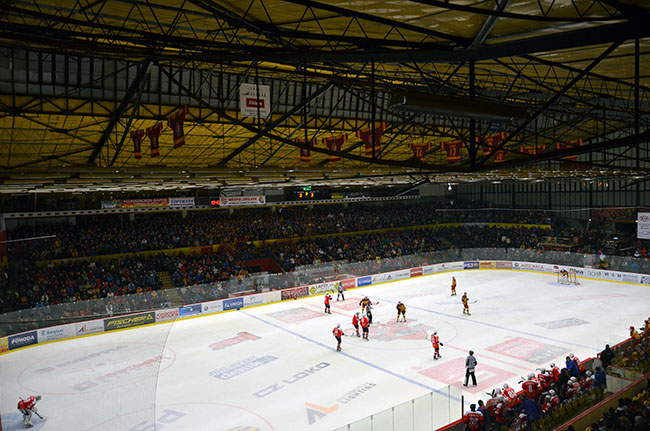 VÝHRA A REKORD. Během probíhajících svátků Vánoc chodí do ochozů nejen prvoligových stadionů vždy o něco větší návštěvy. Nejinak tomu bylo i v posledním domácím duelu mezi Duklou Jihlava a Třebíčí, který se uskutečnil 30. prosince 2015. Na Horácký zimní stadion zavítalo 4787 diváků, čímž byl překonán letitý rekord z roku 2000. Tehdy se na třebíčském stadionu při zápase s Jihlavou sešlo dle oficiálních údajů 4600 diváků. Loňský zápas byl nejen rekordním z hlediska návštěvy, která utvořila fantastickou atmosféru, ale také hodně pohledným - dle slova asistenta trenéra Dukly Františka Zemana podala obě mužstva parádní výkon. Nicméně radovat se mohl pouze jeden tým, o čemž rozhodlo až prodloužení, ve kterém Jihlava brala extra bod navíc a zvítězila celkově 3:2. Foto: Tomáš Buksa.