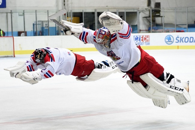 VÍTĚZNÝ SKOK. Takhle slaví české reprezentační gólmanské duo Jakub Škarek (vpředu) a Tomáš Vomáčka každé vítězství na turnaji. Foto: Karel Švec (ČSLH)