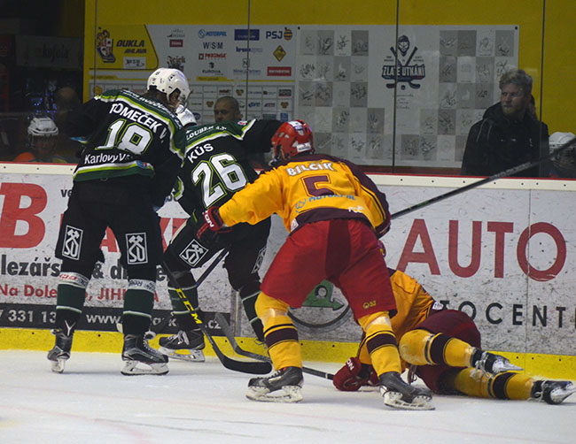 URPUTNÉ BARÁŽOVÉ BOJE. Baráž je bitvou na ostří nože, soupeři si nedarují ani metr ledu. Dukla se v loňské prolínací soutěži radovala proti Karlovým Varům z první tříbodové výhry (předtím porazila Litvínov na nájezdy), ale celkově byly ve vzájemných soubojích lepší Energetici. Ti vyhráli oba dva domácí duely a jejich druhá cesta z Vysočiny byla hodně veselá – po výhře 6:2 si totiž karlovarský klub vybojoval právo extraligy i pro sezonu 2016/2017. Foto: Tomáš Buksa