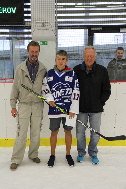 Nejlepší obránce VII. ročníku Memoriálu Jaroslava Pitnera, Jan Sedláček (HC Kometa Brno, uprostřed). Cenu předával syn Jaroslava Pitnera Jiří (vlevo) a legendární útočník Dukly a národního týmu Jiří Holík (vpravo). Foto: Tomáš Lysý