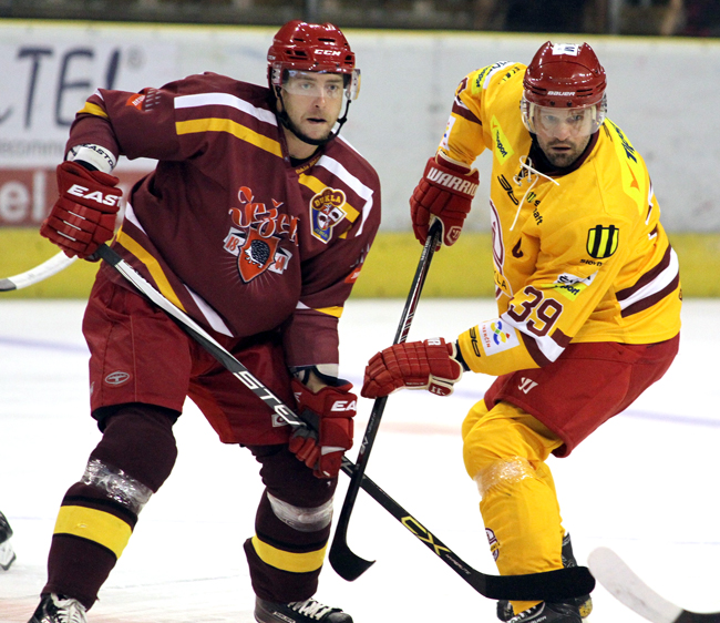 SOUBOJ ČERVENOŽLUTÝCH TÝMŮ. Dva kluby s názvem Dukla, vyznávající stejné barvy, se naposled střetly 13.8.2015 na Rona Cupu, kde Trenčín vyhrál nad Jihlavou 3:0. Dílčí úspěch Jihlavy přišel v doplňkových samostatných nájezdech, které vyhrála zásluhou Lukáše Anděla. O puk tehdy bojovali i Michal Důras (vlevo) proti Róbertu Petrovickému. Slovenský hokejista, kterého do velkého světa hokeje vyslala právě Dukla Trenčín, v roce 2002 vyhrál se Slovenskem historický titul mistra světa, a v NHL nastoupil k 210 zápasům, ukončil po loňské sezoně jako kapitán Trenčína aktivní hráčskou kariéru. Hned poté nastoupil k trenéru Miloši Holáňovi jako jeho asistent. Foto: Zdeněk Drla