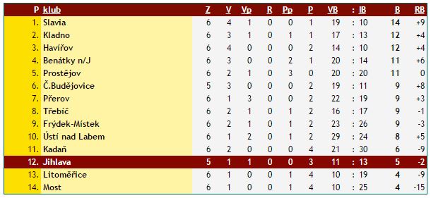 Ani Litoměřicím se nedaří tak, jak by si sami přály. Ačkoliv má Stadion odehráno o jedno utkání více než Dukla (která druhé kolo na ledě Motoru bude dohrávat v prosinci), tabulkově je ještě o pozici níže než Jihlava. Momentálně tak litoměřickým hokejistům patří předposlední třinácté místo se čtyřmi získanými body z šesti utkání. V úvodních třech utkáních vyšli Litoměřičtí bodově naprázdno. První body, a rovnou tři, získali ve čtvrtém kole doma proti Ústí nad Labem. Ani tato výhra však hokejisty z Kalich areny příliš nepozvedla. Následně totiž prohráli na Slavii a doma odevzdali dva body Přerovu za porážku na nájezdy.