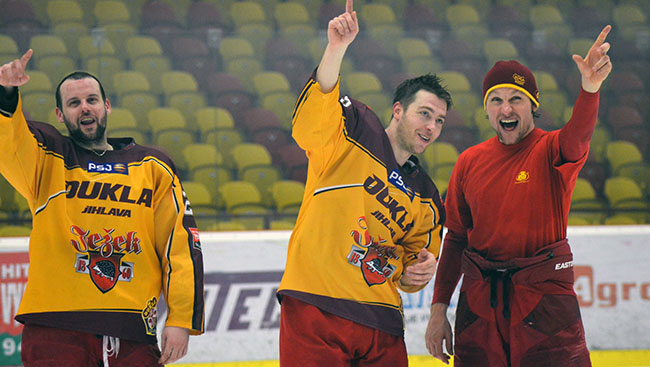 DVĚ VÝHRY 4:2. Jihlava byla loni proti Českým Budějovicím na domácím stadionu stoprocentní. V pětadvacátém kole totiž doma porazila Jihočechy poměrem 4:2 a stejný výsledek si připsala také v loňském předposledním dějství základní části před téměř čtyřmi tisícovkami diváků. Děkovačku s fanoušky si tehdy užil (na fotce zleva) Filip Seman jakožto střelec druhého gólu Dukly, Michal Důras, jenž přidal třetí branku domácích a kapitán Jiří Dobrovolný. Foto: Tomáš Buksa