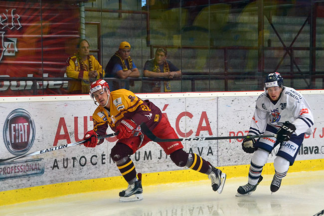 ÚVODNÍ ZÁPAS NEVYŠEL. První vzájemný zápas Dukly proti Benátkám přišel v letošní sezoně na řadu již ve třetím kole (pro Duklu druhé herní). Ačkoliv na konci druhé třetiny v přesilovce prolomil loňský hráč Benátek a letos nejproduktivnější jihlavský bek Jiří Říha (vlevo) bezgólový stav, tři body nakonec získali benátečtí hokejisté. Ti totiž v průběhu třetího dějství třemi brankami otočili stav a dvacet vteřin před koncem již pouze Tomáš Čachotský snížil na konečných 2:3. V loňské sezoně také Dukla nejprve doma s Benátkami prohrála, aby soupeři v dalším zápase na jeho ledě vše vrátila. Bude tomu tak i nyní? Foto: Tomáš Buksa