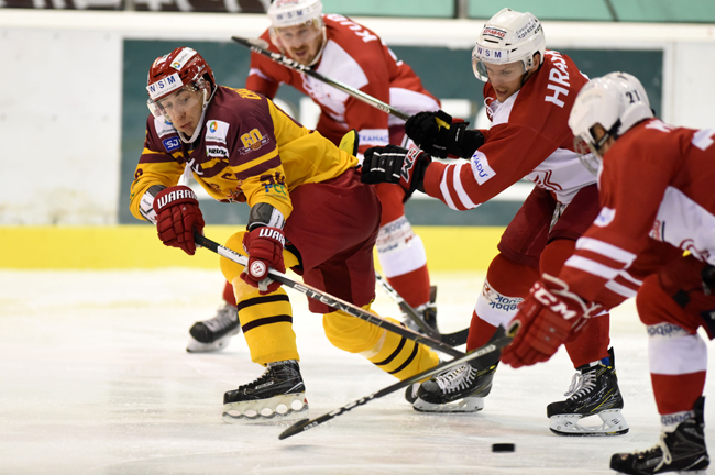 GÓLY DÁVALA SLAVIA. Poslední vzájemný zápas mezi Duklou a Slavií byl v pražském Edenu poměrně vyrovnaný, ač skóre hovořilo výsledkem 3:0 ve prospěch sešívaných. Také poměr střel, při kterém si oba týmy vytvořily několik zajímavých šancí, byl takřka vyrovnaný – 31:30. V Jihlavě se ale nyní představí zcela jiná Slavia. Zatímco Peter Hraško, který na obrázku stíhá nejproduktivnějšího hráče WSM Ligy Tomáše Čachotského, kádr sešívaných opustil, Zdeněk Kubica (nahoře) na palubě červenobílé posádky zůstává nadále. Foto: Karel Švec – ČSLH.