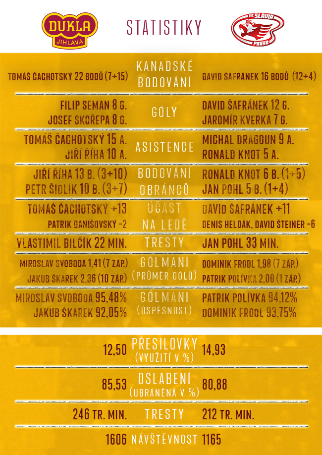 HC Dukla Jihlava: Škarek – Kaláb, Bilčík, Říha, Marcel, Šidlík, Kajínek, Dundáček – Důras, Skořepa, Jergl – Čachotský, Diviš, Jícha – Březina, Seman, Stoklasa – Síkela, Anděl, Danišovský