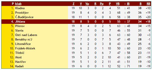 Poslední zápas Dukly byl v mnohém zajímavý. Jihlavští hokejisté doma přivítali omlazenou Slavii Praha a v první třetině byl Miroslav Svoboda prakticky bez práce, když na něj šly – i přes jednu přesilovku hostí – jen dvě střely. Naopak jeden pokus Dukly z třinácti skončil v brance, když dvojnásobnou a dvouminutovou přesilovku pět na tři využil Tomáš Čachotský. Po dvou třetinách byl již poměr střel 30:10, přesto druhé dějství gól nepřineslo. Slavia se ve třetí třetině vzchopila, ovšem když Richard Diviš zvýšil na 2:0, zdálo se být jasno. Pražané však tři minuty před koncem srovnali a najednou zkoušeli vyrovnat, ale již neúspěšně. Jihlava se tak ze čtvrtého místa takřka dotáhla na první trio, které body tratilo. Nicméně tabulka je i tak velice vyrovnaná. Dukla ztrácí na první Kladno čtyři body a její náskok na sedmé Ústí je také čtyřbodový. Po utkání proti Slavii drží jihlavský tým pozici nejméně inkasujícího družstva celé soutěže, když v osmnácti zápasech povolil svým soupeřům jen sedmatřicet branek.