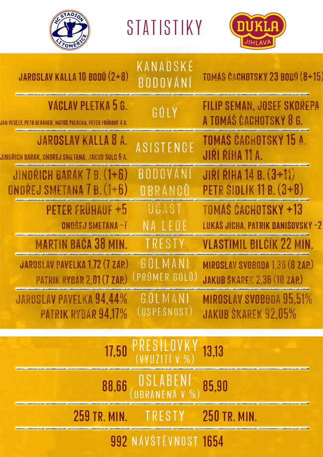 V úvodní třetině zápasu mezi Jihlavou a Litoměřicemi se Dukla ujala dvougólového vedení, když se prosadil Petr Šidlík a Lukáš Anděl. Bezprostředně po druhém jihlavském gólu ale Stadion snížil. Druhá část přinesla zásluhou Aleše Jergla opět dvojnásobný náskok domácích, ten však stačili hosté ještě do druhé přestávky smazat a do kabin se tak šlo za stavu 3:3. Navíc sedm minut před koncem Litoměřice dovršily obrat utkání. Dukla ale třetí porážku v řadě doma nedopustila a minutu a půl před koncem srovnal v početní výhodě, navíc při hře bez gólmana, Michal Důras. Pětiminutové prodloužení i přes dvouminutovou přesilovku Jihlavy pět na tři nerozhodlo, proto vítěze utkání musely určit samostatné nájezdy. Ty ovládl domácí tým zásluhou Tomáše Čachotského – 5:4 po sn.