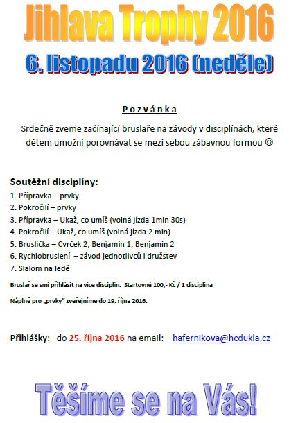 ráda bych Vás pozvala na událost, kterou organizuje oddíl krasobruslení Dukla Jihlava mládež, z.s. V neděli 6.11.2016 pořádáme přípravkové závody pro naše nejmenší bruslaře.