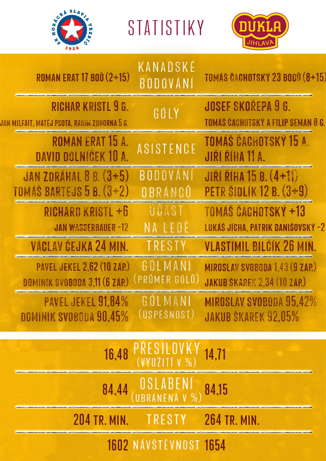 Třebíčští měli poslední zápas hodně nadějně rozehraný. Na ledě Slavie se ujali v první třetině vedení a ve třiatřicáté minutě zvyšoval Adam Raška. Jenže jak se třebíčští hokejisté na vedení nadřeli, tak jej během tří minut po dvou slávistických trefách ztratili. Zápas nakonec došel až do prodloužení, který rozhodl Lukáš Endál. Třebíčský trenér Martin Sobotka na tiskové konferenci potvrdil, že se Horácké Slavii v prodloužení, potažmo na nájezdy, nedaří. Osmkrát jejich zápas nerozhodla základní hrací doba, poté Třebíč pětkrát prohrála v prodloužení, dvakrát na nájezdy a jedinou dvoubodovou výhru brala v nájezdech proti těžkému soupeři - na stadionu Kladna.