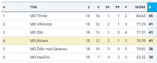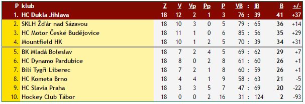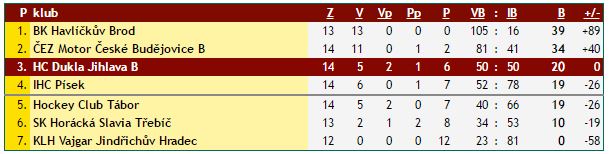 Ze všech šesti sedmičlenných skupin postoupí vždy první čtyři týmy, které vytvoří tři osmičlenné skupiny. Pouze vítězové těchto skupin postoupí do Extraligy mladšího dorostu (B-týmy nemohou postoupit do extraligy - pozn. aut.). V „jihlavské“ tabulce jsou dva odskočené týmy – loňský sestoupivší extraligista Havlíčkův Brod a B-tým Motoru. Za nimi se právě Dukla, Písek a Tábor porvou o dvě zbylá místa ve vyšší nadstavbě. „Havlíčkův Brod je opravdu odskočený. V posledním utkání nám nadělil pořádný debakl, kdy jsme si ani neškrtli. Ostatní týmy jsou hratelné, měli bychom je porážet a zajistit si první čtyřku,“ říká k deseti závěrečným kolům základní části trenér B-týmu mladšího dorostu.