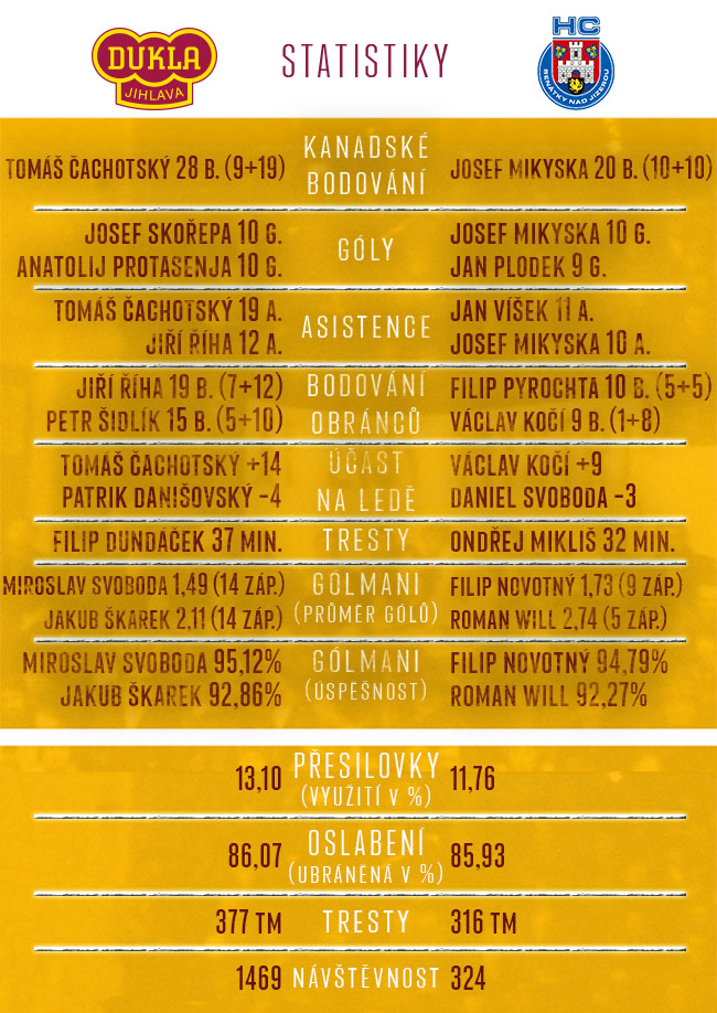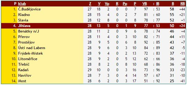 Z ledu Motoru domů s vítězstvím. Dvanáctkrát se českobudějovičtí hokejisté této skutečnosti zdárně postavili a na svém stadionu dovolili pouze Třebíči, aby uzmula jediný bodík. Další tým z Vysočiny si už přijel pro celé tři. Jihlavu poslal před zaplněnými ochozy do vedení v deváté minutě Petr Šidlík, domácí nedlouho poté srovnali. Nerozhodný stav vydržel až do pětačtyřicáté minuty, kdy David Březina vystihl rozehrávku Motoru a trefil levou šibenici. V dalším průběhu třetího dějství došlo i na bitku domácího Benjamina Walkera proti jihlavskému zadákovi Filipu Dundáčkovi. Pěstní souboj Duklu ještě více nabudil a tři body bez potíží udržela. Z utkání nejlepších obran WSM Ligy tak vyšla vítězně ta jihlavská, což znamenalo, že si červenožlutí polepšili na rovných 50 bodů a udrželi kontakt s týmy před sebou.