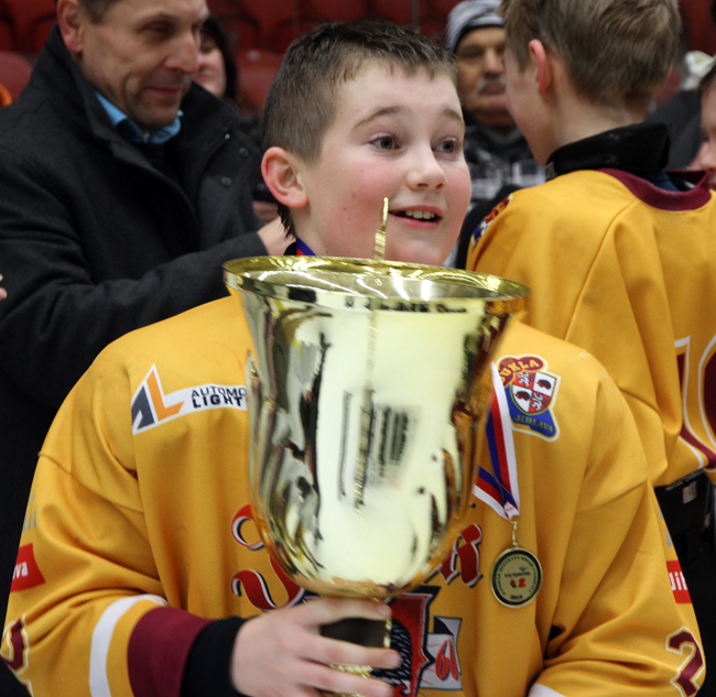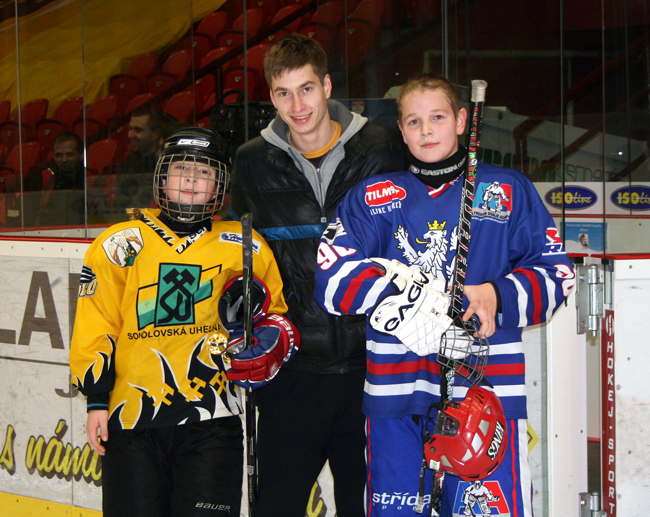 CENY NEJLEPŠÍM HRÁČŮM. Nejlepší hráči jsou oceňováni po každém zápase, ceny jim předávají hokejové legendy, partneři jihlavského hokeje nebo hráči A-týmu. Jedním z nich byl před pěti lety kupříkladu gólman David Rittich. Foto: Archiv www.hcdukla.cz