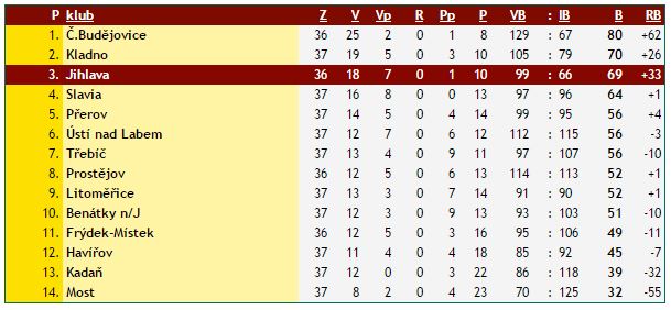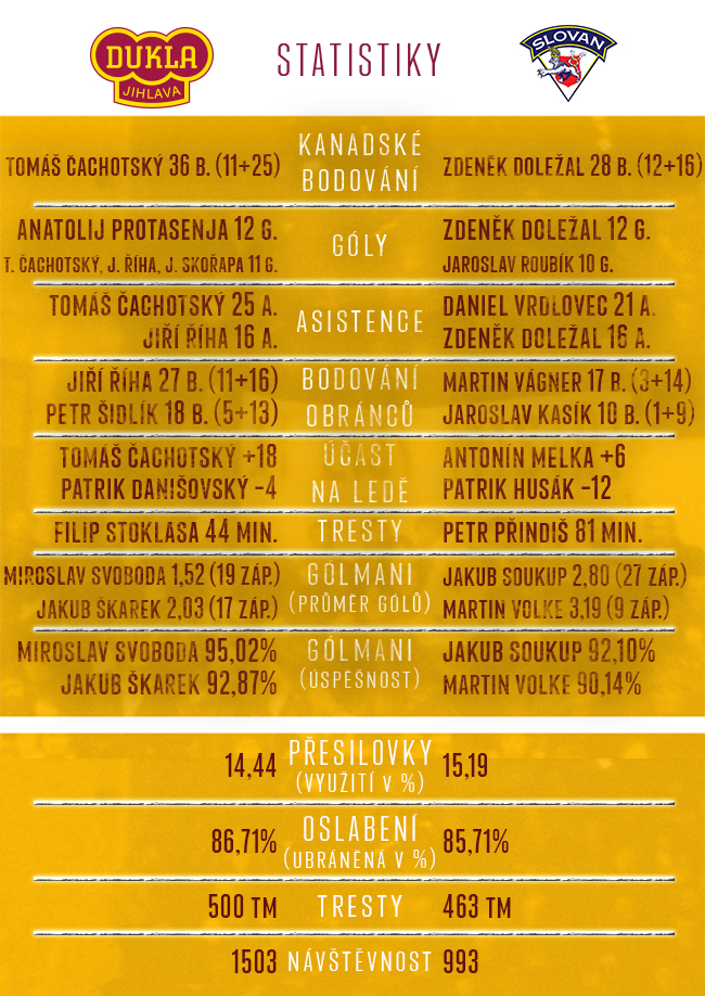 HC Dukla Jihlava: Svoboda – Říha, Bilčík, Kajínek, Půža, Kaláb, Dundáček, Dobrovolný – Čachotský, Skořepa, Protasenja – Jergl, Seman, Zeman – Březina, Diviš, Jícha – Danišovský, Stoklasa