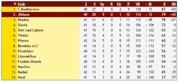 Frýdek-Místek se proto upnul následujícím čtyřem domácím utkáním v řadě – tím spíše, že hostil dva nejhorší týmy soutěže. A dvakrát vyhrál shodným poměrem 4:3. Nejprve frýdeckomístečtí hokejisté udolali poslední Most 4:3, v dalším kole dokázali dvakrát srovnat vedení Kadaně a porazit Sportovní klub 4:3 na nájezdy. Jenže na dvě výhry se hráčům s Rysem ve znaku nepodařilo navázat a v posledním kole doma prohráli důležitý souboj s Litoměřicemi. Důležitý v tom ohledu, že se Stadionem bojují právě o desáté místo, které jako poslední zajišťuje postup do předkola play-off. Frýdek-Místek sice dvakrát stáhl dvougólové vedení Litoměřických na jeden gól, ale nakonec padli 2:5. Z devátého místa tak Frýdek klesl na pozici jedenáctou, jelikož jeho další soupeř o desítku Prostějov vyhrál v Třebíči 0:3. Situace na těchto místech tabulky je ovšem velice vyrovnaná. Sedmý Přerov má 60 bodů a Frýdečtí na něj z jedenácté pozice ztrácí šest bodů, což jsou dvě vyhraná utkání.