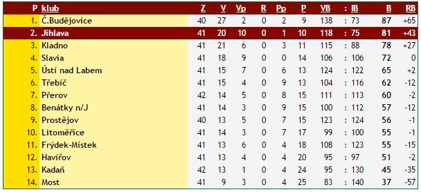 Další vítězství v novém roce. A také čtrnácté vítězství z posledních patnácti zápasů. Ne nadarmo těšilo útočníka Tomáše Čachotského, že Dukla ve Slezsku nepřerušila sérii vítězství. Frýdek-Místek totiž nebyl kvůli spolupráci s partnerským Třincem příliš příjemným hostitelem. Nad druhým celkem tabulky dvakrát vedl, nejprve ve druhé třetině, poté ještě devět minut před koncem. Ovšem Jihlava dokázala během 32 vteřin otočit stav zápasu a od výhry jí dělily sotva dvě minuty. Jenže i za pomocí zlomené hole jednoho z jihlavských hráčů stihli domácí srovnat a poslat zápas do prodloužení. V něm se červenožlutí letos podesáté radovali z dvoubodové výhry a lehce uskočili třetímu Kladnu, se kterým se perou o druhé místo. Jihlava má aktuálně na Rytíře náskok tří bodů, oproti tomu na první Motor ztrácí bodů šest a Jihočeši mají k dobru utkání v Prostějově.