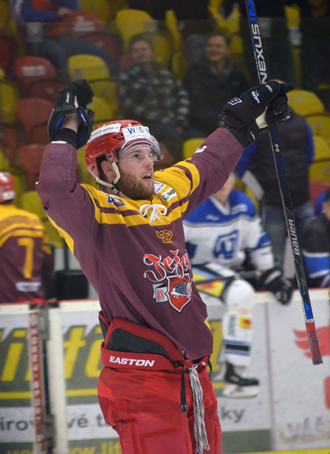 ŠÍDLO ROZHODL PRODLOUŽENÍ. Jihlava se s Havířovem letos utkala již třikrát a vyjma prvního vzájemného utkání na ledě Slezanů, kdy vyhrála jednoznačně 4:1, byla zbylá dvě klání hodně vyrovnaná. Na Horáckém zimním stadionu se sice Dukla v první třetině vedení 2:0, ovšem po čtyřiceti minutách bylo srovnáno. Gólem a asistencí se na vyrovnání podílel útočník Lukáš Anděl, který tehdy z Jihlavy hostoval v Havířově. Utkání rozhodlo až prodloužení a rána Petra Šidlíka (na obrázku) od modré. Třetí vzájemné měření sil se neslo ve znamení Mikuláše, čerta a anděla, kteří zavítali na havířovský stadion. Jihlava se jich ale nezalekla a gólem Adama Zemana ze sedmé minuty vyhrála 1:0. Foto: Tomáš Buksa