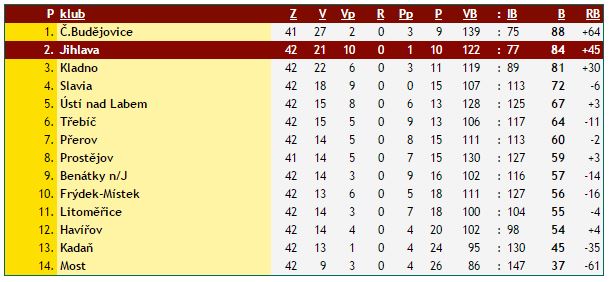 První polovina utkání v Benátkách měla pro jihlavské hokejisty stejný průběh jako předešlý zápas ve Frýdku-Místku. Domácí celek se totiž dvakrát ujal vedení. Nejprve v deváté minutě, načež poměrně rychle srovnával Josef Skořepa. Ač šli Benátečtí před polovinou zápasu opět vedení, Tomáš Čachotský našel bleskovou odpověď a třetí třetina již patřila Dukle, která svého soupeře výrazně přestřílela. A hlavně se radovala ze dvou gólů. Ve 42. minutě si připsal vítěznou a přesilovkovou trefu Petr Šidlík, pět minut před koncem pojistil tři body David Březina. Jihlava tak má ze 42 zápasů přesně 84 bodů a nachází se na druhém místě tabulky s postem nejúspěšnějšího týmu na hřištích soupeřů. Na první Motor (jenž má zápas navíc) ztrácí Dukla čtyři body, naopak na třetí Kladno má tři body k dobru.