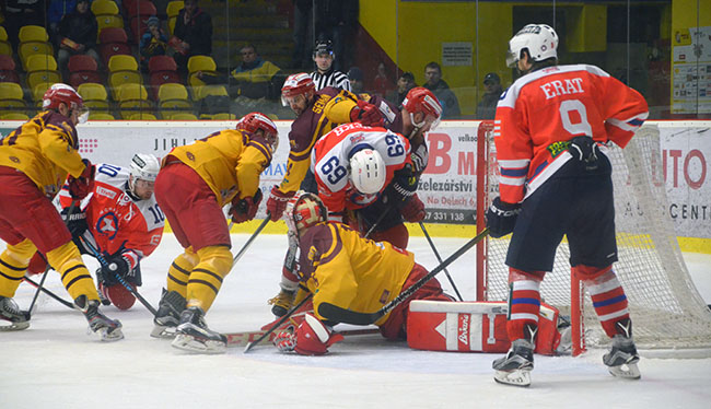 NAPOSLED ZVÍTĚZILA TŘEBÍČ. V posledních dvaceti utkáních se Dukla radovala hned osmnáctkrát z vítězství. Jediné dvě jihlavské porážky má na svědomí Kladno, jenž červenožluté udolalo v novém roce zatím jako jediné, a právě Horácká Slavia Třebíč. Ta vyhrála v posledním domácím utkání Jihlavy v roce 2016 poměrem 3:1 a o první dva góly do sítě Miroslava Svobody se postaral Roman Erat – první sám vstřelil a na druhý nahrál. Bratr známějšího Martina Erata, jenž dlouhá léta hrával v NHL a nyní nastupuje za Kometu, je však v současné době zraněný. Foto: Tomáš Buksa