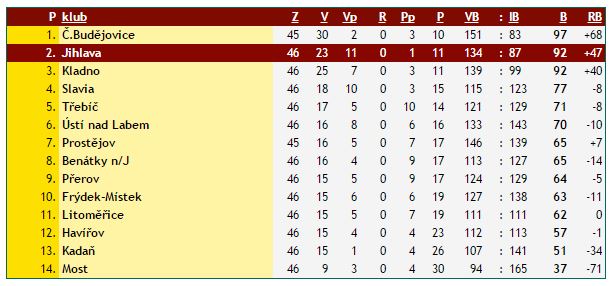 Dnešní jihlavský soupeř, SK Horácká Slavia Třebíč, má za sebou utkání, které mohlo napovědět o jejím umístění po základní části. Po nevýrazném začátku se Bílé hvězdy propracovali až na místa znamenající přímý postup do play-off, když vyhráli deset utkání z třinácti. Rázem se tak přiblížili čtvrté Slavii Praha, stejně jako Ústí nad Labem, na rozdíl pěti bodů. A právě v Edenu sehráli Třebíčští pořádnou bitvu, ve které po první třetině vedli 1:0 a tři minuty po začátku druhého dějství vedení navýšili. Sešívaní však po polovině zápasu dokázali snížit a pět minut před koncem vyrovnat. Ba co víc, nakonec vyhrát na nájezdy. Slavia je tak se 77 body čtvrtá, což je umístění, které zaručuje start čtvrtfinále na domácím ledě. Pátá Třebíč na ní ztrácí šest bodů a šesté Ústí o bod více.