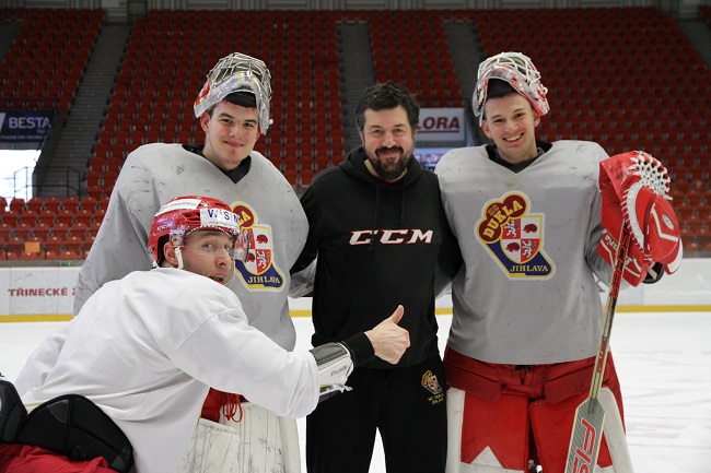 Po skončení dopoledního rozbruslení panovala dobrá nálada. Kapitán týmu Tomáš Čachotský (vlevo) využil situace, kdy se kustod Dukly Bohuslav Tománek (druhý zprava) nechal vyfotografovat s gólmany Miroslavem Svobodou (vpravo) a Jakubem Škarkem (druhý zleva). Foto: Zdeněk Drla