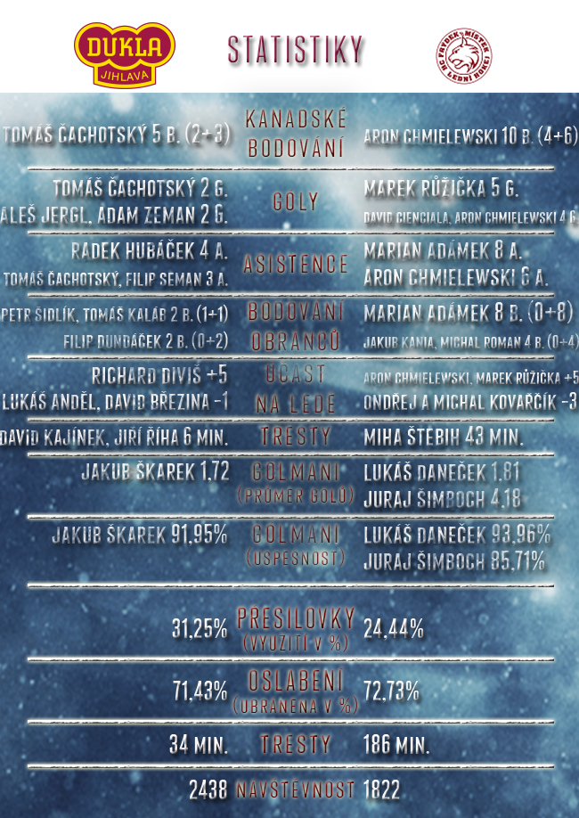 Farmářský tým Třince tak musel ve čtvrtém utkání odvracet první hrozbu konce sezony. Začal opět dobře, když se ujal ve třetí minutě vedení. Jenže Jihlava ještě v první třetině otočila zápas hezkou přesilovkou kombinací Tomáše Kalába a branou Davida Březiny. Nicméně před odchodem do šaten využili domácí přesilovku a rozuzlení přišlo zkraje třetí části, kdy se znovu v přesilovce trefil ex-jihlavský zadák Miha Štebih. Duklu tentokrát zradila koncovka, šancí totiž měla dostatek. Kotouč párkrát poskakoval na brankovišti, ale jihlavští hráči ho prostě za záda Lukáše Danečka nedostrkali, případně v dobrých střeleckých pozicích minuli tři tyče. Frýdek-Místek tak v domácím prostředí Haly Polárky poprvé v sezoně Jihlavu porazil.