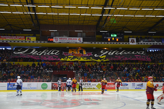 DOMA DVAKRÁT NEZAVÁHALI. Duklu hnala k výhrám v prvních dvou zápasech i parádní divácká kulisa, ve které si hráči nedovolili vypustit ani jeden souboj a bojovali o každý milimetr ledu. První klání orámovalo výborné choreo jihlavských fanoušků, na druhý zápas přišlo ještě o 90 diváků více než na první – 4116. Foto: Tomáš Buksa