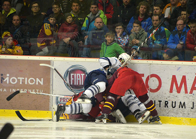 BITVA O BARÁŽ. Nemůže být sporu o tom, že se hraje o hodně. Není se na co šetřit, ve hře je poslední místo v baráži o extraligu 2017. Hráči obou týmů nechávají na ledě všechno, mnoho soubojů je hodně na hraně únosnosti, některé za hranou. Souboj dvou klubů, jenž psaly tuzemskou hokejovou historii, dostane rozhřešení buď ve středu 22. března nebo o dva dny později. Foto: Tomáš Buksa.