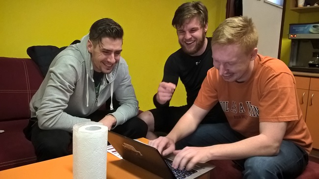 Legrace u offline rozhovoru. Zpovídanému Tomáši Jiránkovu (vlevo) radí nejlepší odpovědi obránce Petr Šidlík (uprostřed). Foto: Zdeněk Drla