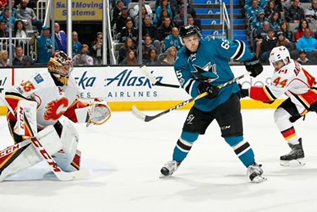 Premiéra Davida Ritticha v NHL. V dresu Calgary Flames odchytal celou třetí třetinu zápasu na ledě San José Sharks. Z deseti pokusů soupeře inkasoval pouze jednou - při přesilovce dvakrát tečovanou střelou. Foto: Twitter Calgary Flames