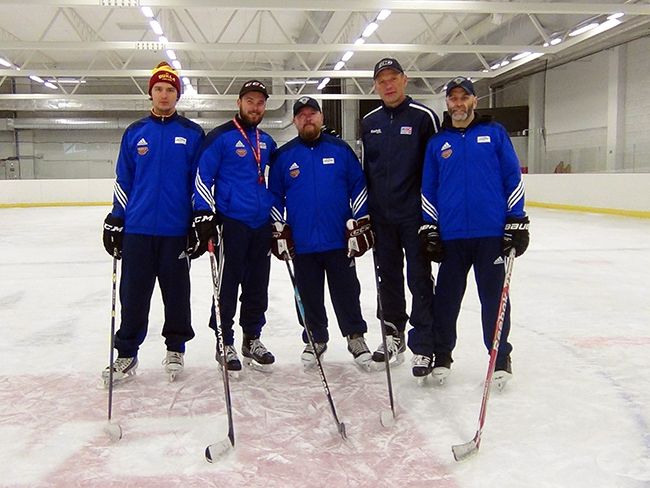 František Musil během rozhovoru a po tréninku s kouči Romanem Peschoutem, Jakubem Vencem, Jarkkem Mattilou a Mattim Rantou. Fofo: Tomáš Lysý