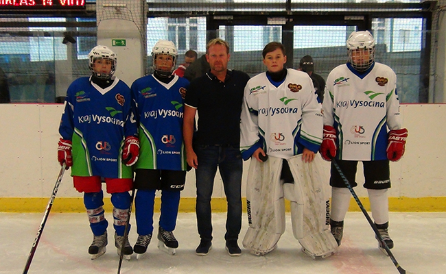 Ceny pro nejlepší hráče zápasu předával Petr Jaroš (uprostřed), trenér gólmanů Dukly Jihlava a Českého hokejového národního týmu. Předtím dělal trenéra gólmanů u běloruské, norské a slovenské reprezentace a u Dinama Minsk v KHL. Nejlepšími hráči byli vyhlášeni Filip Vašák, Aapo Mäenpää (Blue Lightnings) a z White Rangers Pavel Pulda a Mikael Miiluniemi. Foto: Tomáš Buksa