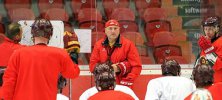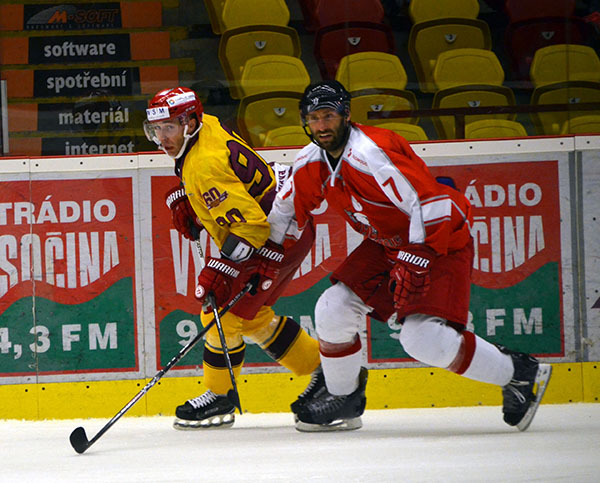 LONI VYSOKÁ PORÁŽKA. Poslední duel mezi Duklou a Olomoucí se datuje k 2.8.2016, kdy jihlavští hokejisté doma v rámci Dukla Cupu prohráli s Hanáky 0:6. Pro červenožluté to tehdy bylo vůbec první utkání přípravy, ve kterém zkoušeli i nové tváře v kádru a mladé hokejisty. Z kádru, který nakonec Tomáš Čachotský (vlevo) jako kapitán dovedl do extraligy, do tohoto zápasu nastoupilo jen 12 hráčů z jednadvaceti. Foto: Tomáš Buksa