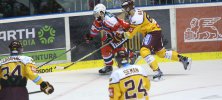 NAPOSLEDY V PARDUBICÍCH. Dukla v posledním zápase proti Dynamu v baráži o extraligu, byla jediným jistým postupujícím mužstvem. Zápas skončil 4:2 pro Dynamo a stal se tak spolu s Duklou účastníkem nadcházejícího ročníku extraligy. Foto: Jan Jedlička