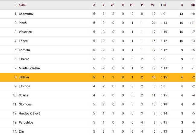 Tabulka TELH 2017/2018 po 5. kole: