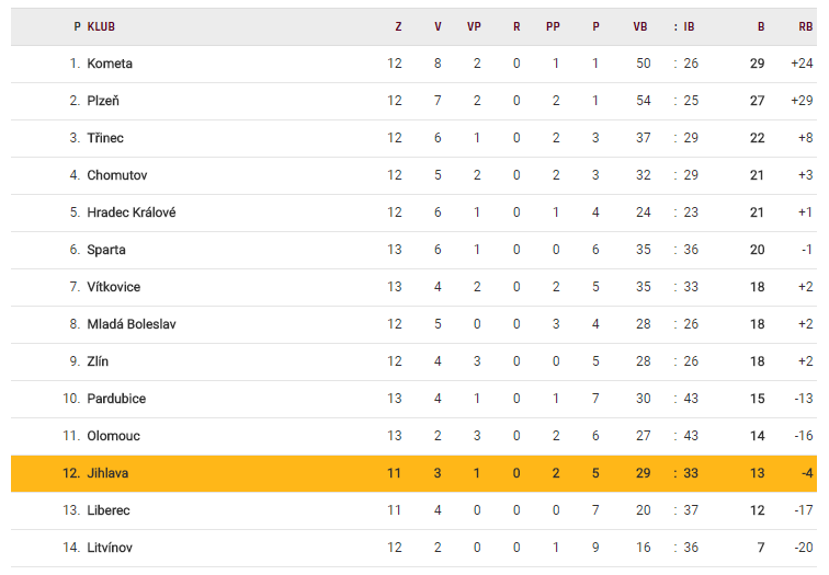 Tabulka TELH 2017/2018 po neúplném dvanáctém kole